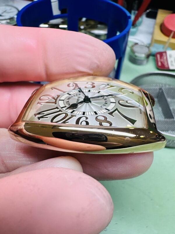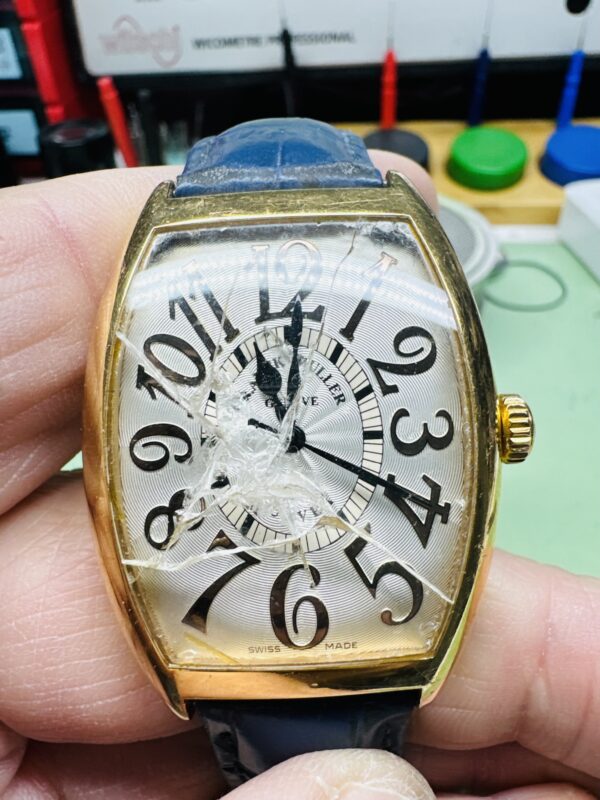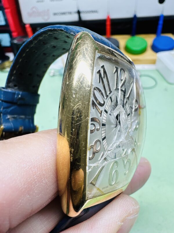 Όταν ένα ρολόι Franck Muller φτάνει στο εργαστήριο, δεν πρόκειται ποτέ για μια απλή εργασία. Στη συγκεκριμένη περίπτωση, είχαμε μπροστά μας ένα Curvex με caliber 2800, το οποίο είχε υποστεί σοβαρό χτύπημα, με αποτέλεσμα την πλήρη θραύση του κρυστάλλου, έντονες φθορές στην κάσα και τον άμεσο κίνδυνο εισχώρησης θραυσμάτων στη μηχανή.