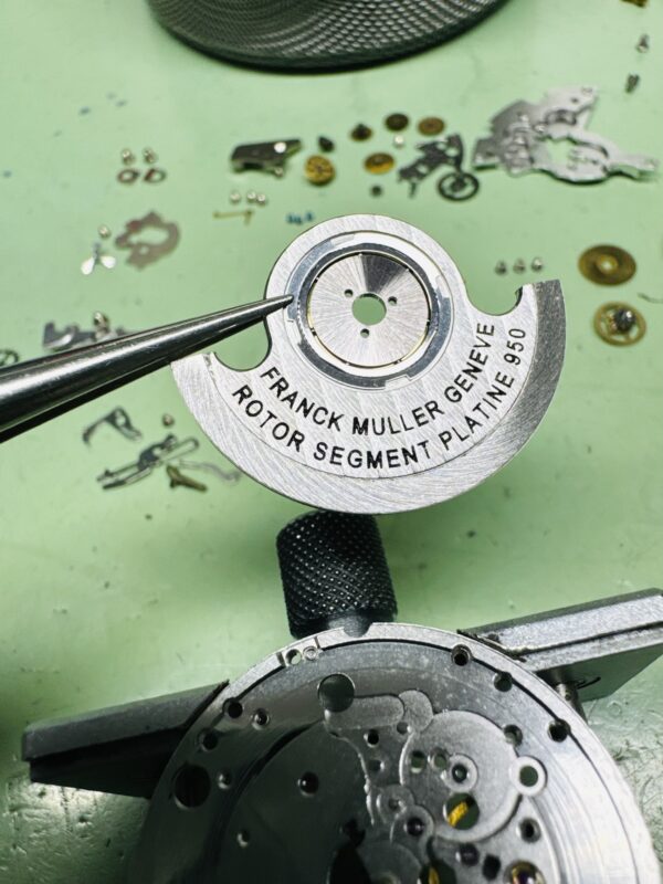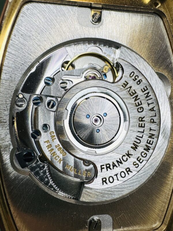 Η μηχανή Franck Muller Cal. 2800, με τον χαρακτηριστικό rotor segment πλατίνας 950, αποσπάστηκε και εξετάστηκε λεπτομερώς. Παρά το χτύπημα, δεν εντοπίστηκαν δομικές ζημιές, ωστόσο κρίθηκε απαραίτητο πλήρες service, καθώς μικροσωματίδια και κραδασμοί μπορούν με την πάροδο του χρόνου να προκαλέσουν φθορά.