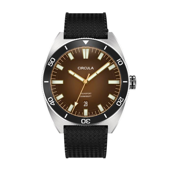 Circula AquaSport II Brown Tropic, καταδυτικό ρόλοι που συνδυάζει αναζωογονητικό σχεδιασμό με εξοπλισμό υψηλής ποιότητας και επεξεργασία. Κάσα από ανοξείδωτο ατσάλι βουρτσισμένη στο χέρι με μαύρο καουτσούκ λουράκι, περιστρεφόμενη στεφάνη από κρύσταλλο Σαπφείρου, καφέ καντράν με φωτεινούς δείκτες.