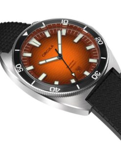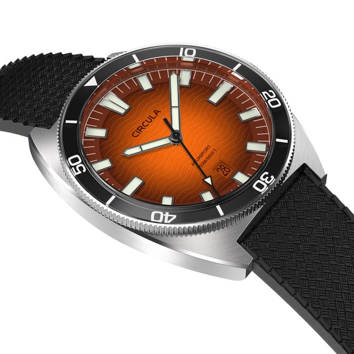 Circula AquaSport II Orange Tropic, καταδυτικό ρόλοι που συνδυάζει αναζωογονητικό σχεδιασμό με εξοπλισμό υψηλής ποιότητας και επεξεργασία. Κάσα από ανοξείδωτο ατσάλι βουρτσισμένη στο χέρι με μαύρο καουτσούκ λουράκι, περιστρεφόμενη στεφάνη από κρύσταλλο Σαπφείρου, πορτοκαλί καντράν με φωτεινούς δείκτες.