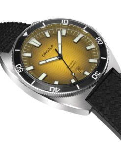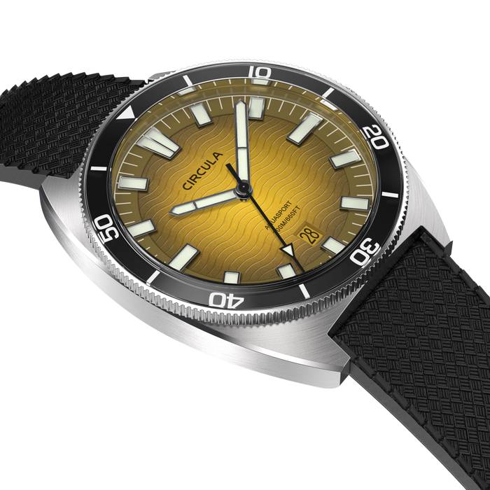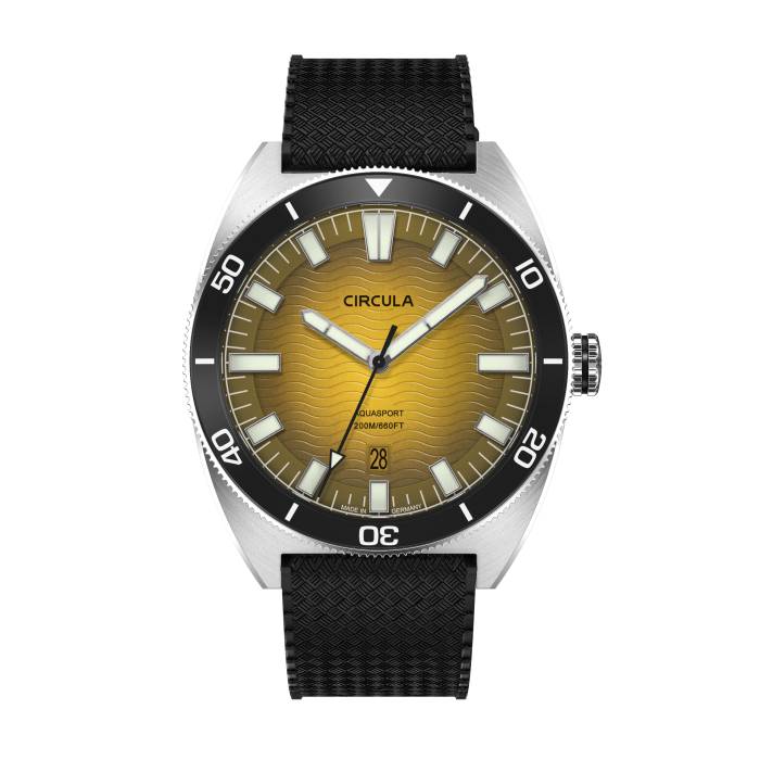 Circula AquaSport II Yellow Tropic, καταδυτικό ρόλοι που συνδυάζει αναζωογονητικό σχεδιασμό με εξοπλισμό υψηλής ποιότητας και επεξεργασία. Κάσα από ανοξείδωτο ατσάλι βουρτσισμένη στο χέρι με μαύρο καουτσούκ λουράκι, περιστρεφόμενη στεφάνη από κρύσταλλο Σαπφείρου, κίτρινο καντράν με φωτεινούς δείκτες.