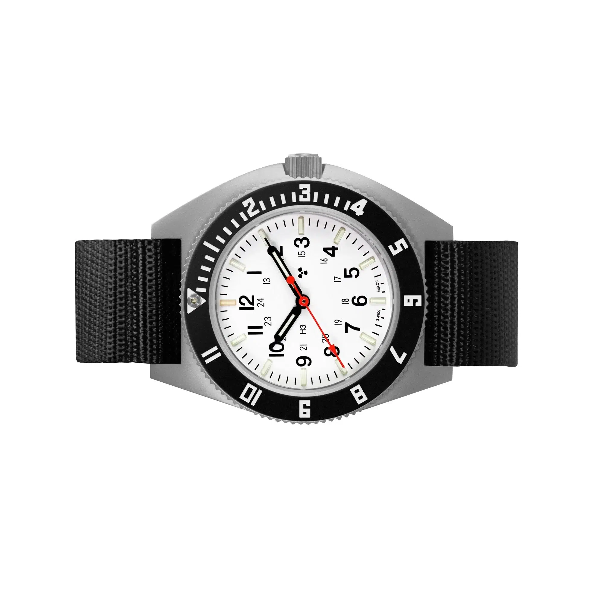 Το Marathon Arctic Steel Navigator (SSNAV) – 41mm είναι ένα σπορ ρολόι στρατιωτικών προδιαγραφών και ελβετικής κατασκευής. Κάσα από ανοξείδωτο ατσάλι με μαύρο Νάιλον λουράκι. περιστρεφόμενη αμφίδρομος στεφάνη και λευκό καντράν με σωλήνες αερίου Τριτίου.