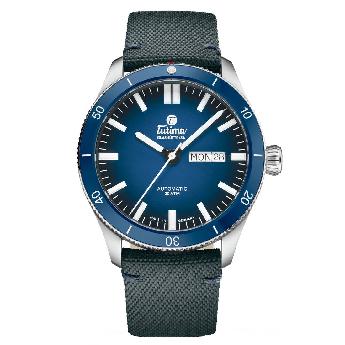Ανδρικό αυτόματο ρολόι Tutima Grand Flieger Airport 6107-01 με θήκη από ανοξείδωτο ατσάλι 41 mm, περιστρεφόμενη κεραμική στεφάνι, δίχρωμο καντράν μπλε/μαύρο και 20 ATM / 200 m αντοχή στο νερό. Ένα ρολόι πιλότου από το Glashütte με μοντέρνο σχεδιασμό, σαφή αναγνωσιμότητα και στιβαρή τεχνολογία από την Tutima.