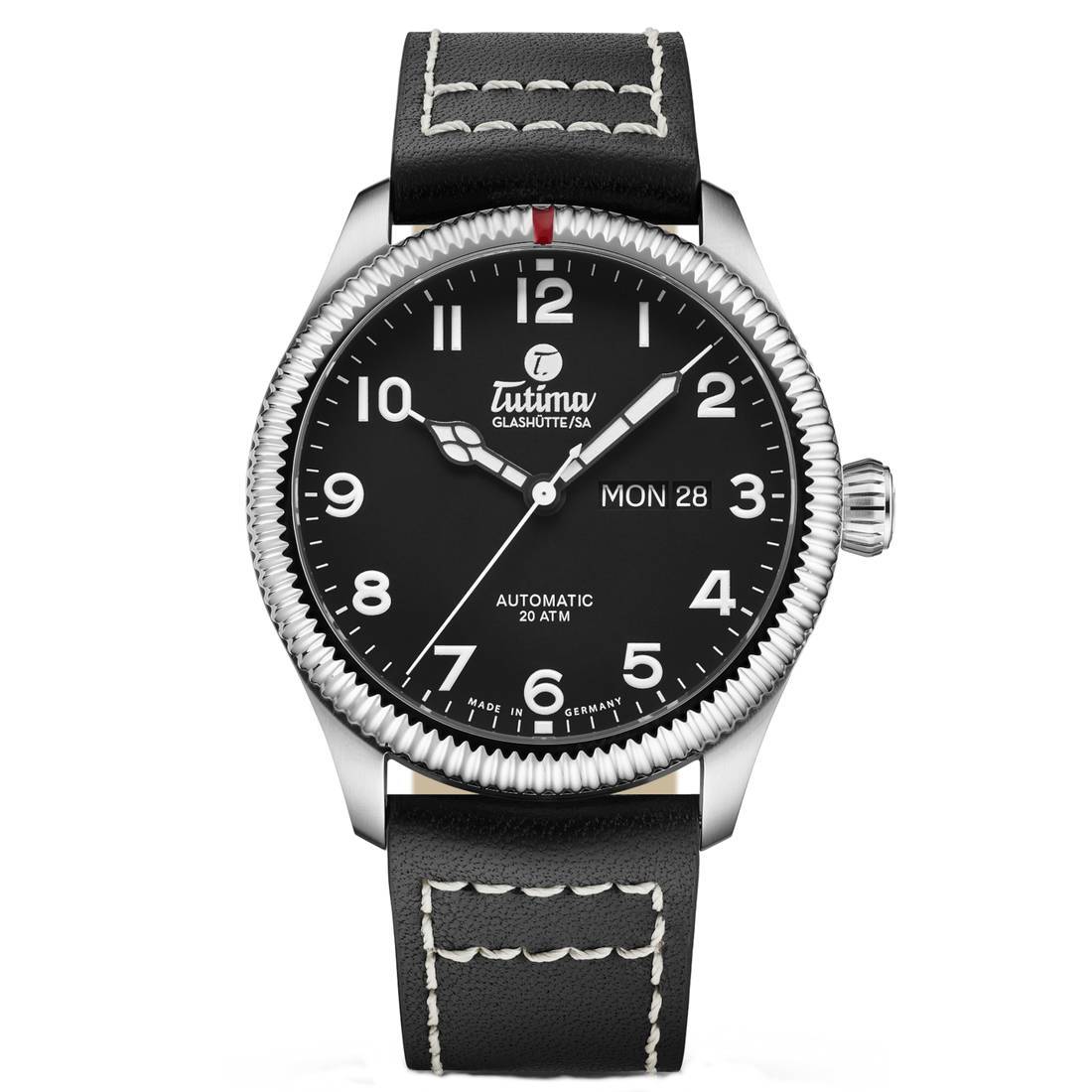 Ανδρικό αυτόματο ρολόι Tutima Grand Flieger Classic 6108-01. με θήκη από ανοξείδωτο ατσάλι 41 mm, περιστρεφόμενη στεφάνι, μαύρο καντράν και 20 ATM / 200 m αντοχή στο νερό. Το κλασικό ρολόι πιλότου από το Glashütte, αναθεωρημένο και εκσυγχρονισμένο με κάθε λεπτομέρεια με την υπογραφή Tutima.